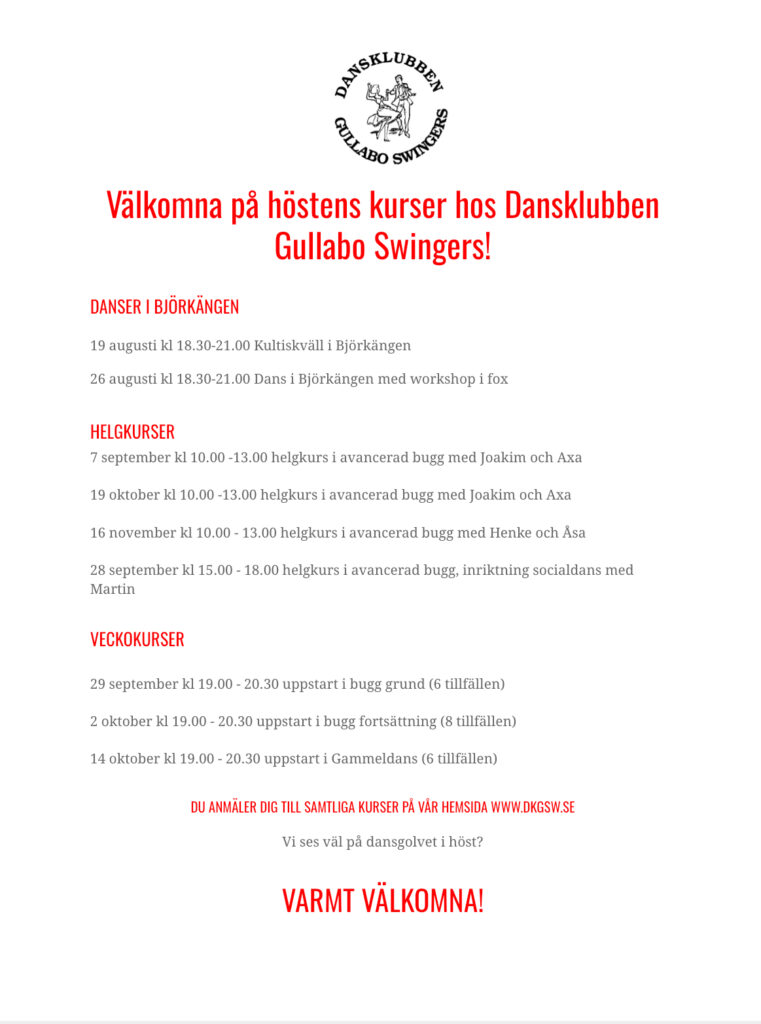 Det blir 3 tillfällen med start söndagen den 16 november. Dessa kvällar tillämpar vi garage med framflytt för att alla ska få dansa.